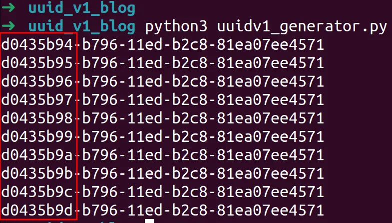 Note that the output is almost identical save for the eight byte in the first segment. This is because the MAC address is staying the same but the clock is changing. Generated over a longer period more bytes will change, but given these values were generated in less than a second, we only expect a minimal amount of change.