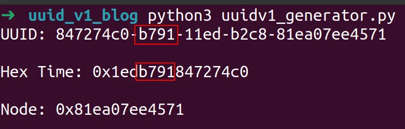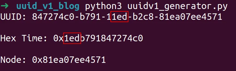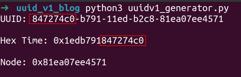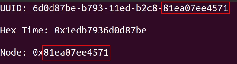 Examining the output, we can see final 8 bytes of the time value in epoch time converted to hex match the first 8 bytes of the UUID.